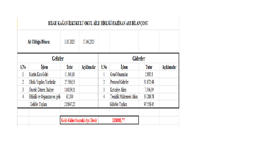 OKUL AİLE BİRLİĞİ HAZİRAN GELİR GİDER TABLOSU